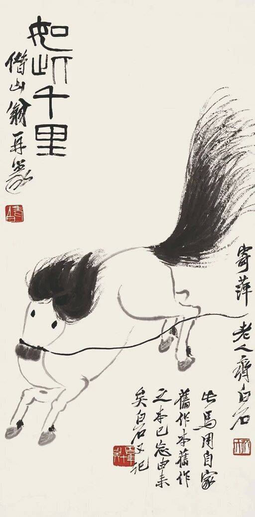一说到画马,人们往往想到的是徐悲鸿,而说到齐白石,则更多想到的是画虾。在齐白石众多绘画题材中,“马”这一题材稀见异常,齐白石最具代表性的两幅画马的作品分别是《如此千里》和《春柳奔马》,从画作本身上看,白石老人这两幅马画都非常有趣,两幅马整体造型、动作相似,都有着黑色的豆豆眼和大写意的飘逸鬃毛和尾巴。