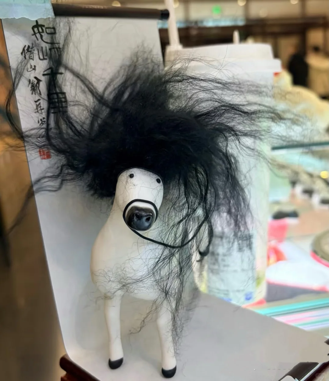 “在看到《如此千里》这幅画的时候我们眼前一亮,觉得很有趣味性,同时也有点犯难,这怎么做呢?怎么才能表现出这匹小马简练洒脱的笔墨和充满趣味的风格呢?”在使用软陶还原马奔腾形态的同时,团队使用滩羊毛的发排来还原鬃毛和尾巴飘逸的质感,“头发的创新算是无心插柳了,其实也可以选择用低成本的聚酯毛发,整体外观也不会受太大影响。但为了更加好的品质,我们最终还是选择了制作BJD娃娃时使用的羊毛发排,这样更加飘逸灵动。”