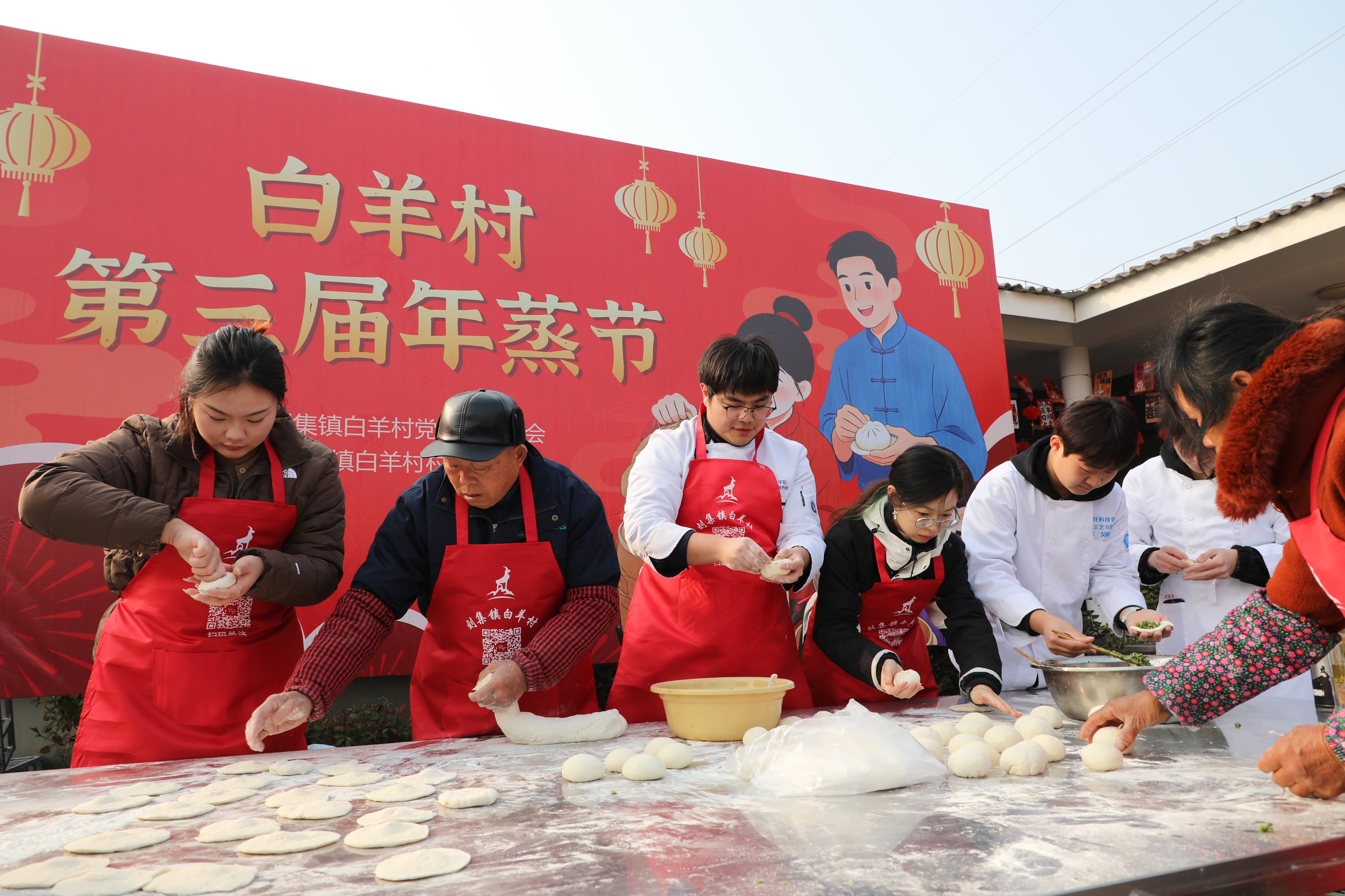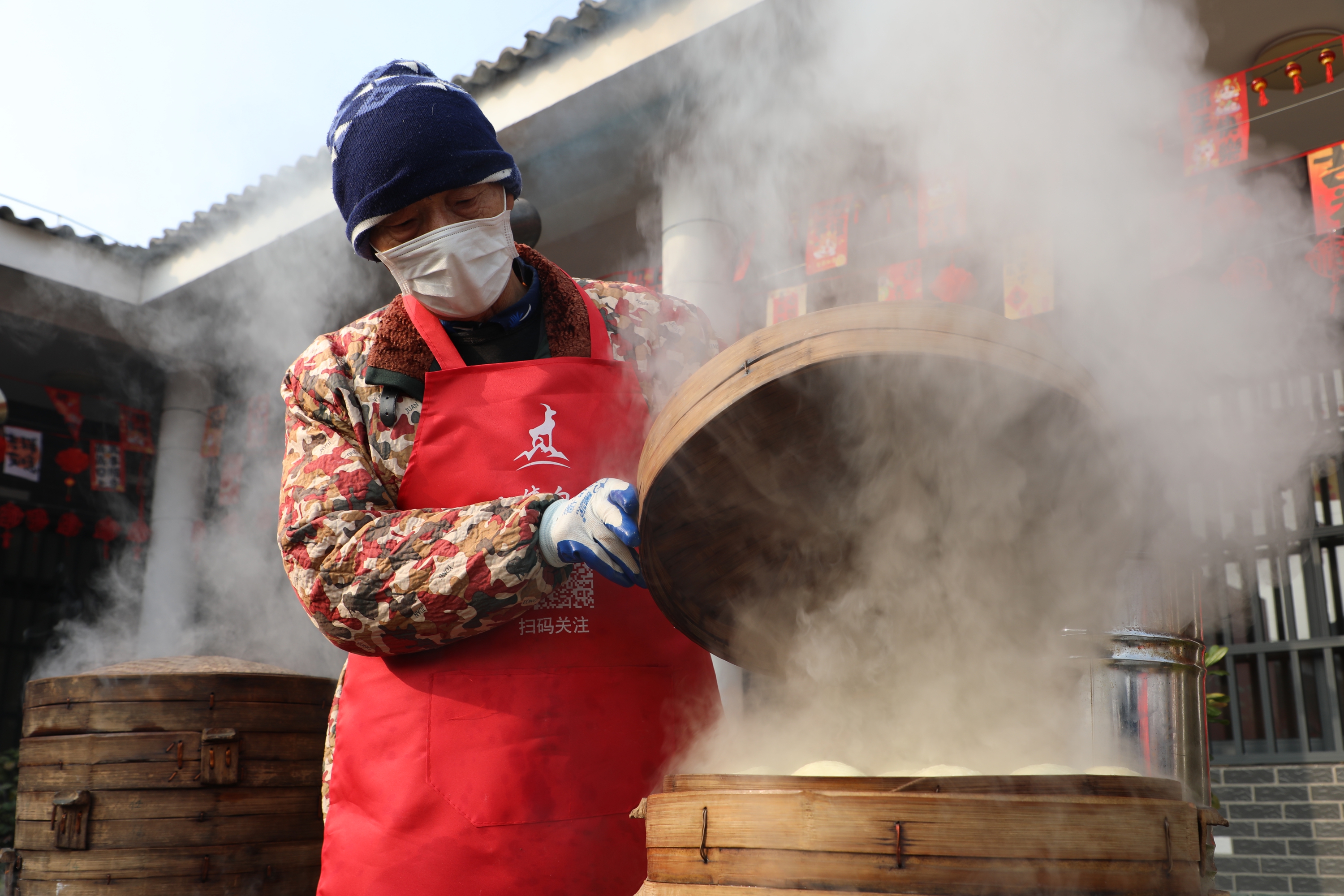 广场上的大锅灶热气腾腾,馒头、包子、方糕在蒸屉中逐渐膨松。村民们围站灶台旁,分工进行揉面、包馅、点红等工序,配合默契、其乐融融。