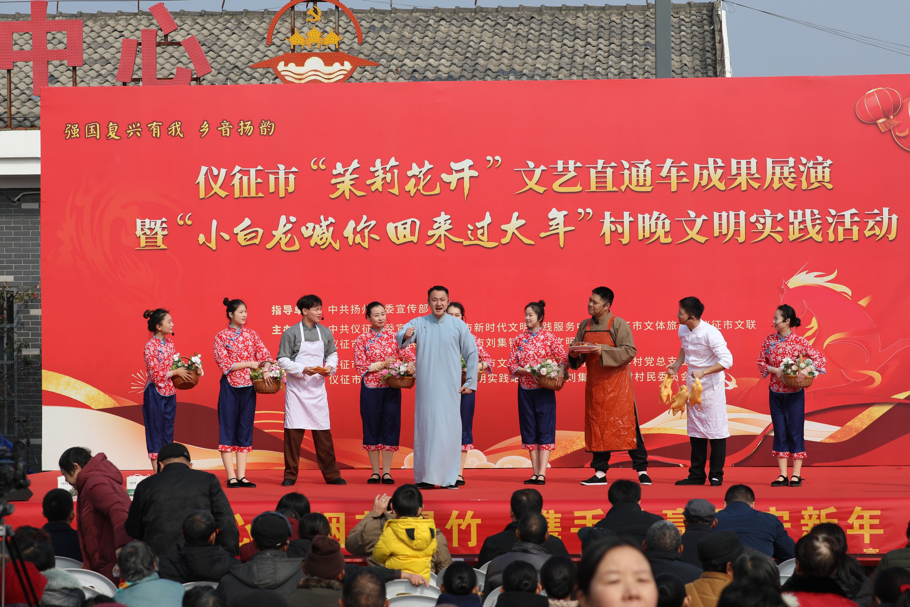2月2日上午,“茉莉花开”文艺直通车展演暨“小白龙喊你回来过大年”村晚文明实践活动,在仪征刘集镇白羊村火热举行。米面飘香与文艺展演相融,浓浓乡愁与新春年味交织,让乡村提前沉浸在过年的喜庆氛围中。