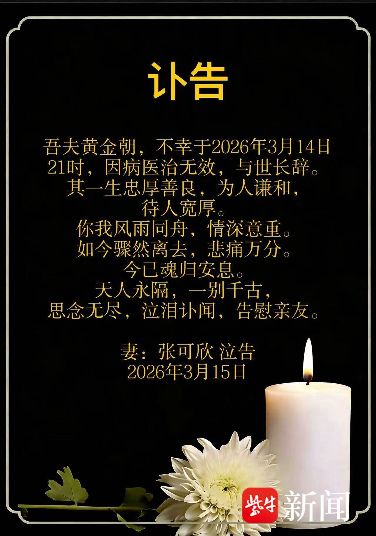 3月15日,江苏省京剧院青年京剧演员黄金朝的妻子发布讣告,黄金朝因病医治无效,于3月14日21时与世长辞,年仅34岁。