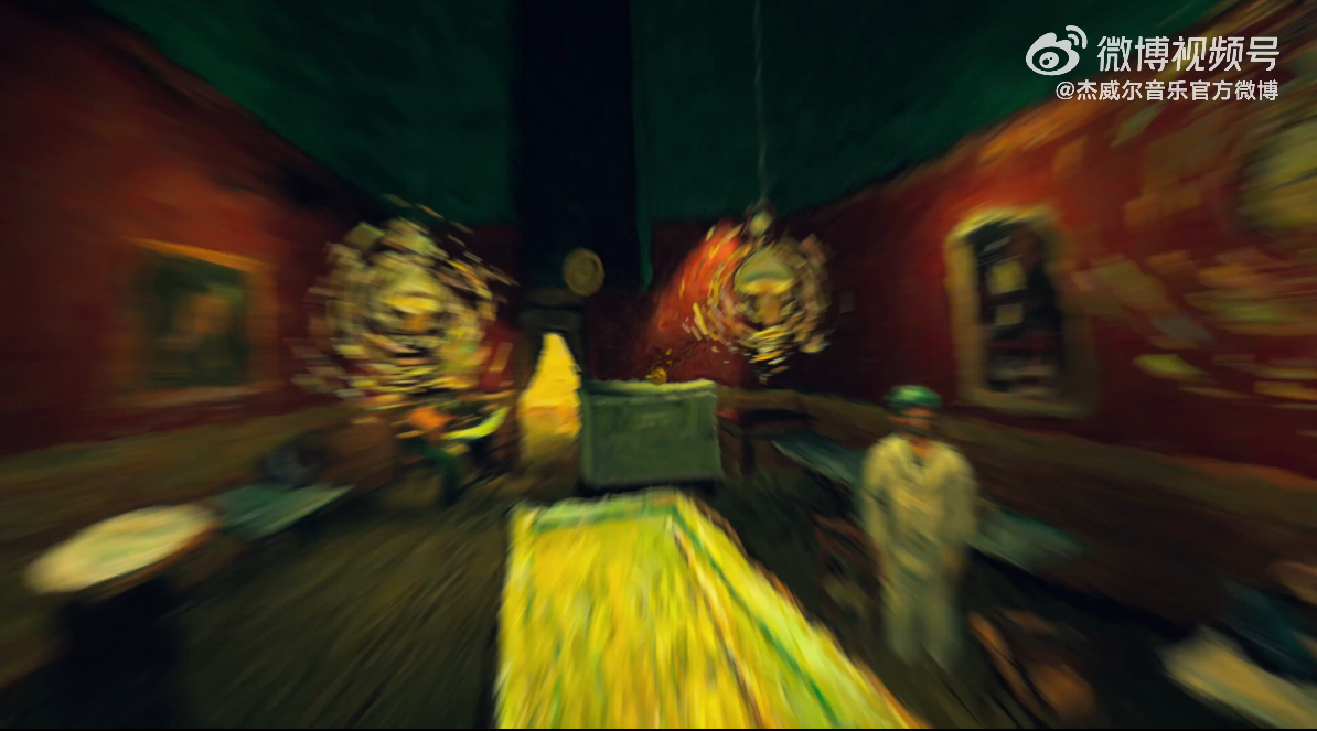 跟随镜头快速向周杰伦面部推进,观众开始进入文森特·梵高的世界,首先出现的是梵高的《夜间咖啡馆》,原画中咖啡馆桌面上摆放的淡粉色瓶花替换成了梵高的另一幅名画《向日葵》,原画中墙上的钟表则向超现实主义的捕手萨尔瓦多・达利《记忆的永恒》中的经典元素“融化的钟”致敬。