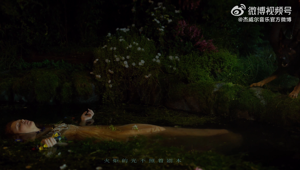 侦探周杰伦拿起桌上的信件后,他拿着火把和一群人发现了沉在水中女子,这一画面是致敬了米莱斯的《奥菲莉亚》,这是拉斐尔前派的代表作之一,以细腻的自然主义笔触描绘了莎士比亚戏剧《哈姆雷特》中奥菲莉亚溺亡的悲剧瞬间,画面中的每一朵花、每一片叶子都具有象征意义,如紫罗兰象征忠诚,雏菊象征纯真,而罂粟则暗示死亡。