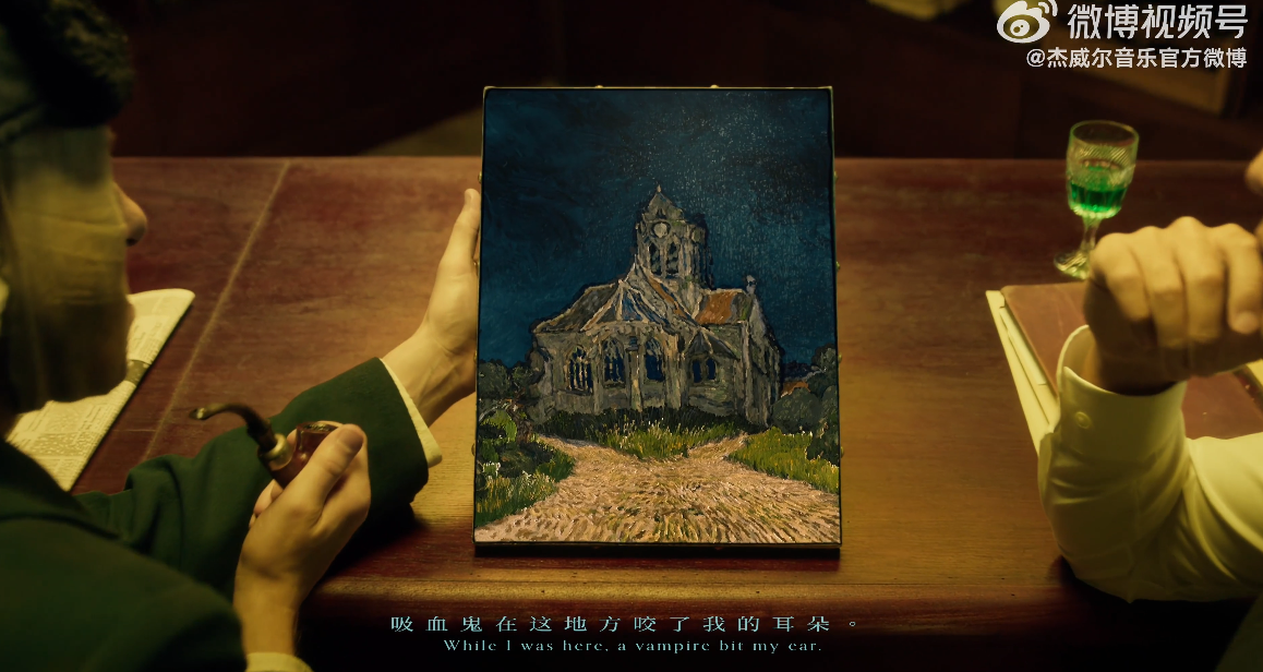 MV中的梵高说“吸血鬼在这地方咬了我耳朵”时,出示了一幅油画,这也是梵高的作品,名为《奥维尔教堂》,这是梵高生命最后几个月中最著名的作品之一,当时他离开了精神病院前往巴黎郊外的奥维尔。到这里,MV进入了最终片段,侦探周杰伦大战吸血鬼并取得胜利,而到这,整个MV进度条刚到四分钟。