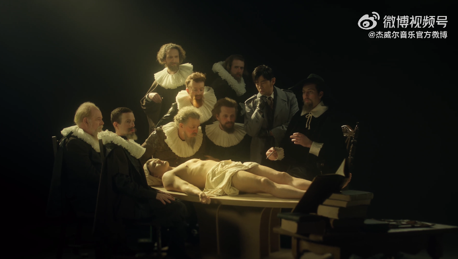 紧接着画面转入一群人围着看尸体,周杰伦也在人群中细细端详,这幅画面致敬了现实主义艺术大师伦勃朗的《杜普教授的解剖课》,画面中杜普教授正在为大家讲解解剖手术的实践方法,显得十分老练,一旁的人都在认真听讲解,为这是一张有情节的群体肖像画,也是后人研究伦勃朗光最典型的材料之一。