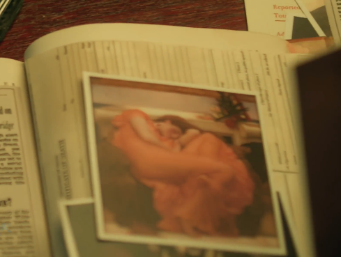 在书上放着穿着橙色长裙的女子的画是弗雷德里克·雷顿的作品《炽热的六月》,也被称为《燃烧的六月》,雷顿是一位英国维多利亚时代画家,其作画风格古典,这幅画是雷顿最有名的作品,画面绘制了一名熟睡的女子。