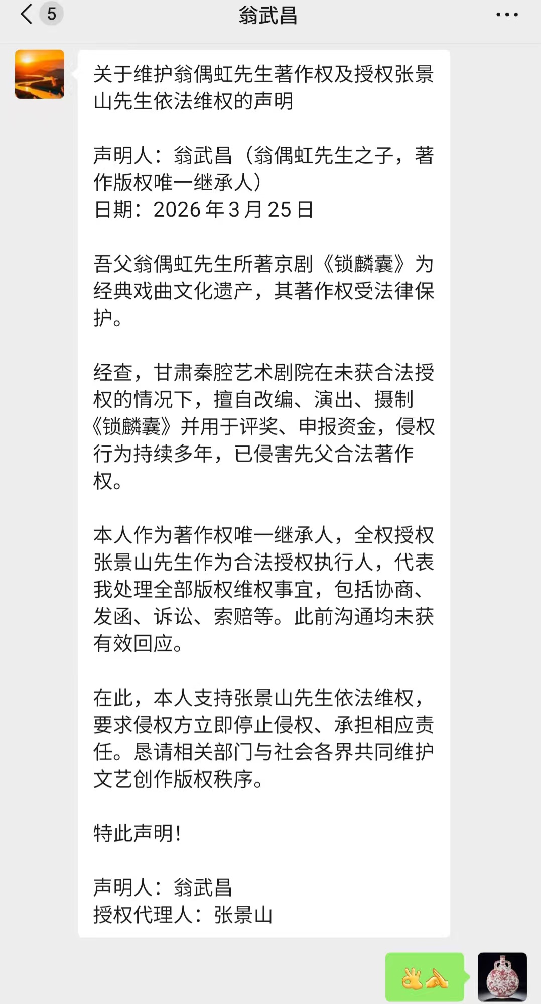 张景山注意到《锁麟囊》剧本遭到侵权,最开始是在2025年,“当时北京一个电视台上播放了京剧电影工程《锁麟囊》,纵观全片和舞台剧版京剧《锁麟囊》没有区别,但这部电影始终没有出现原作编剧翁偶虹的名字。”随后张景山开始与该电影的制片方中国戏曲学院相关负责人沟通,对方表示了歉意,此事经过双方的沟通协商圆满的结束了。