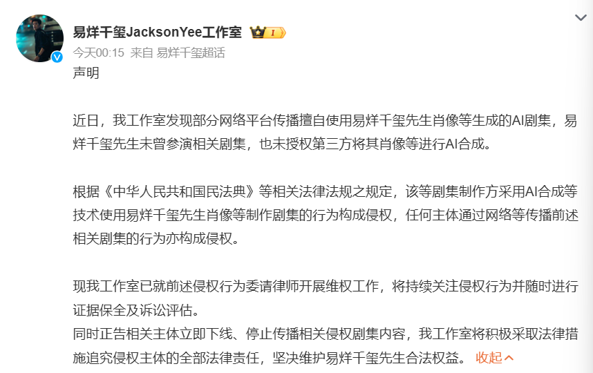 AI短剧盗脸易烊千玺工作室维权,维权终点不能停在“下架”