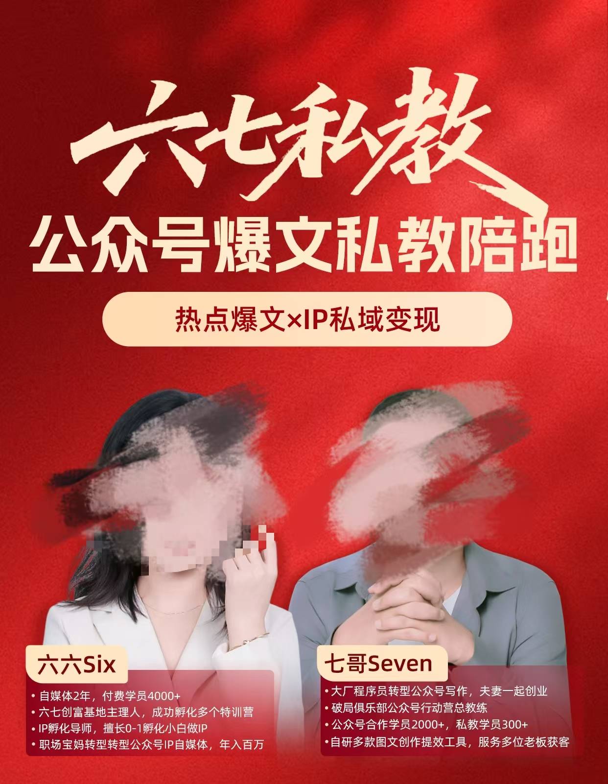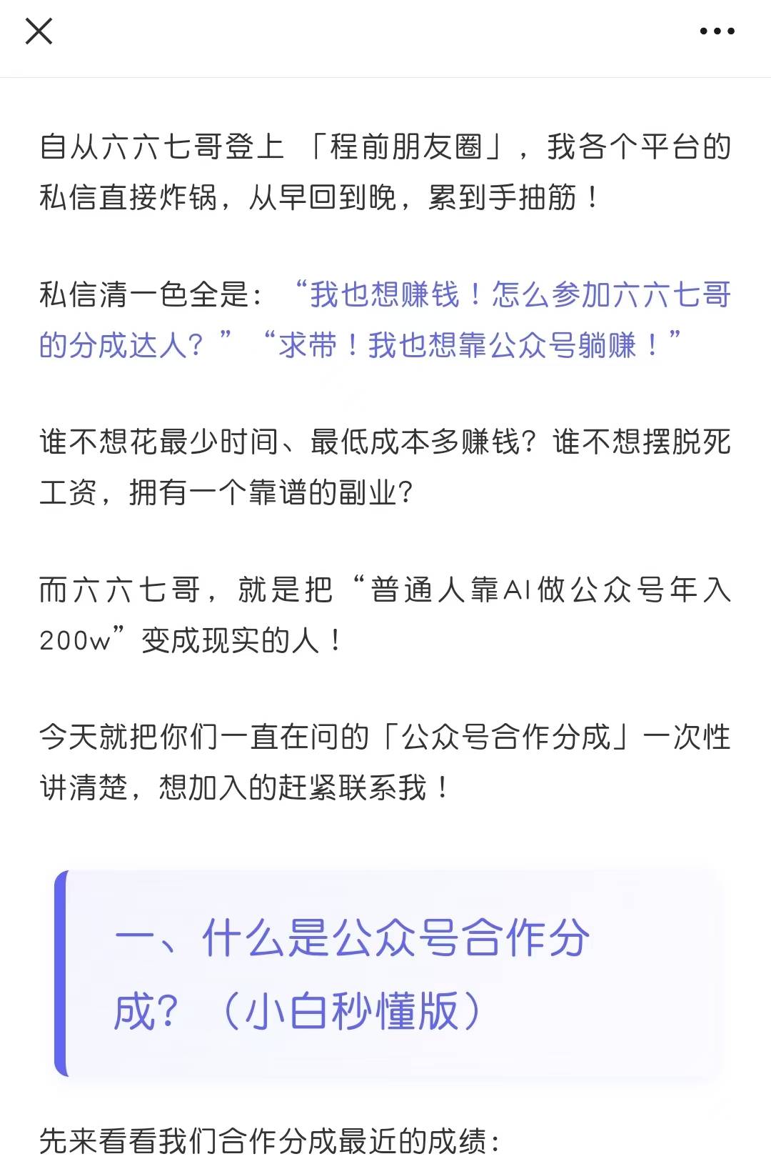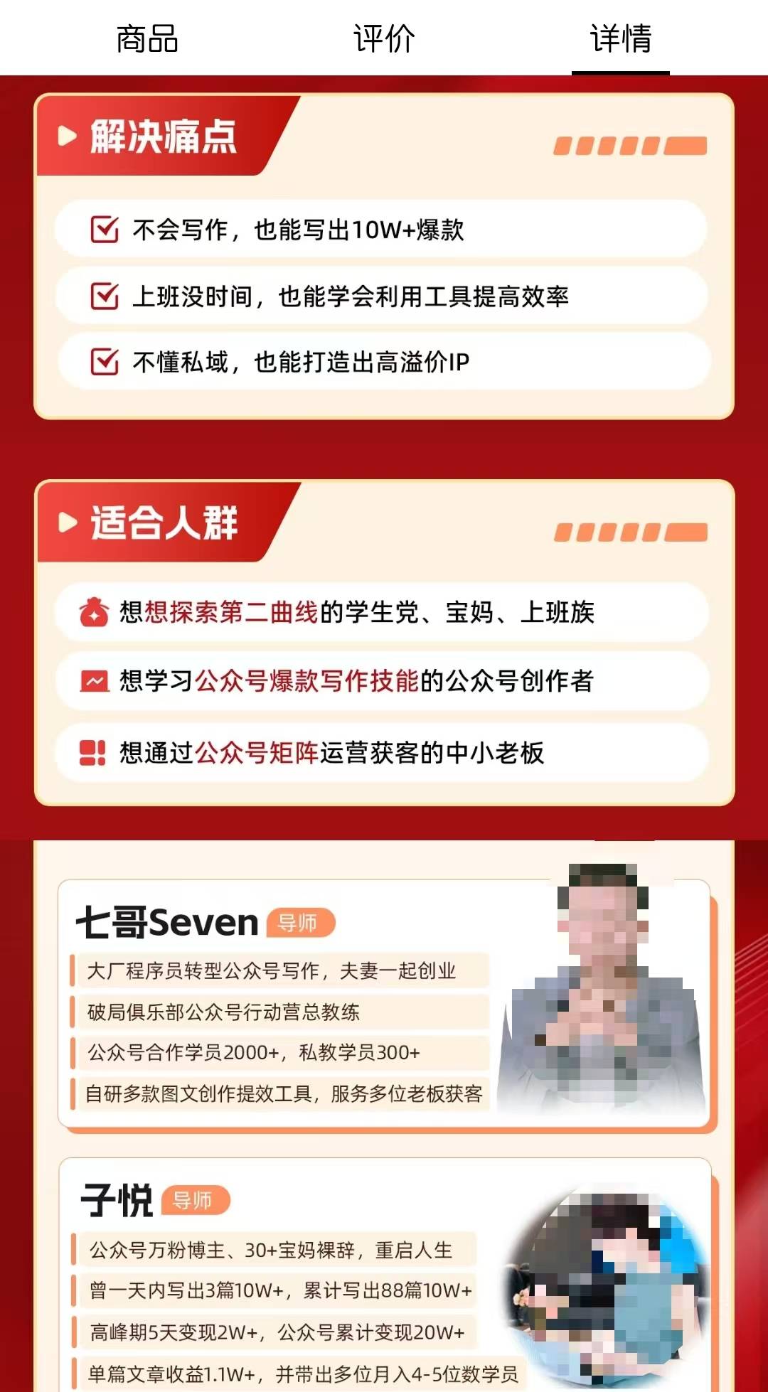 “爆了么AI”课程形式为私域教学,向学员发送电子资料,进群视频直播教学,高级课程还有一对一私聊教学等。从其上架的课程简介里,我们不难嗅到一丝熟悉的味道。课程宣传关键词包括“零基础可以学会”,项目门槛“是会操作电脑或者手机”,适合人群为“想探索第二曲线的学生党、宝妈、上班族”,号称是“不会写作也能写出10万+爆款”“上班没时间也能用工具提高效率”“不懂私域也能打造高溢价IP”。主要授课的导师有六六、七哥、子悦等人,人设定位也很“清晰”,六六是“职场宝妈转型AI一人企业,年入百万”,七哥是“前大厂程序员转型AI一人公司”,子悦是“30岁宝妈裸辞,重启人生。”宣传的成果也极其诱人,动辄就是“一天内3篇10万+”“5天变现2万”“成员累计变现七位数”“多位学员月入过万”等等。