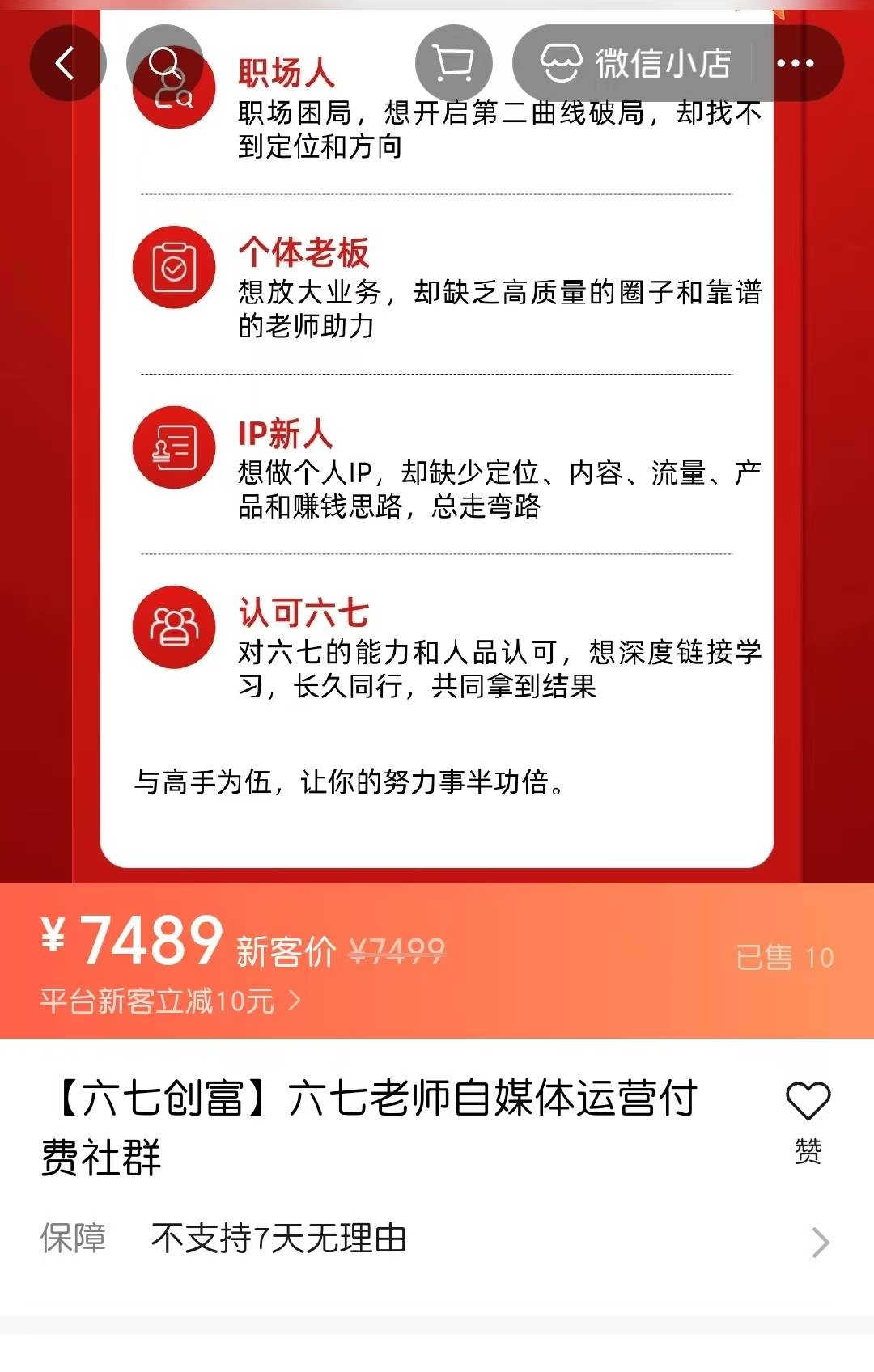 4月10日上午,“爆了么AI”的商品橱窗还能正常下单,浏览商品内容。课程的价格从289元到7489元不等,名头大多是“六七创富”“六七私教”,这个微店开店时长有338天,已售出439个商品。