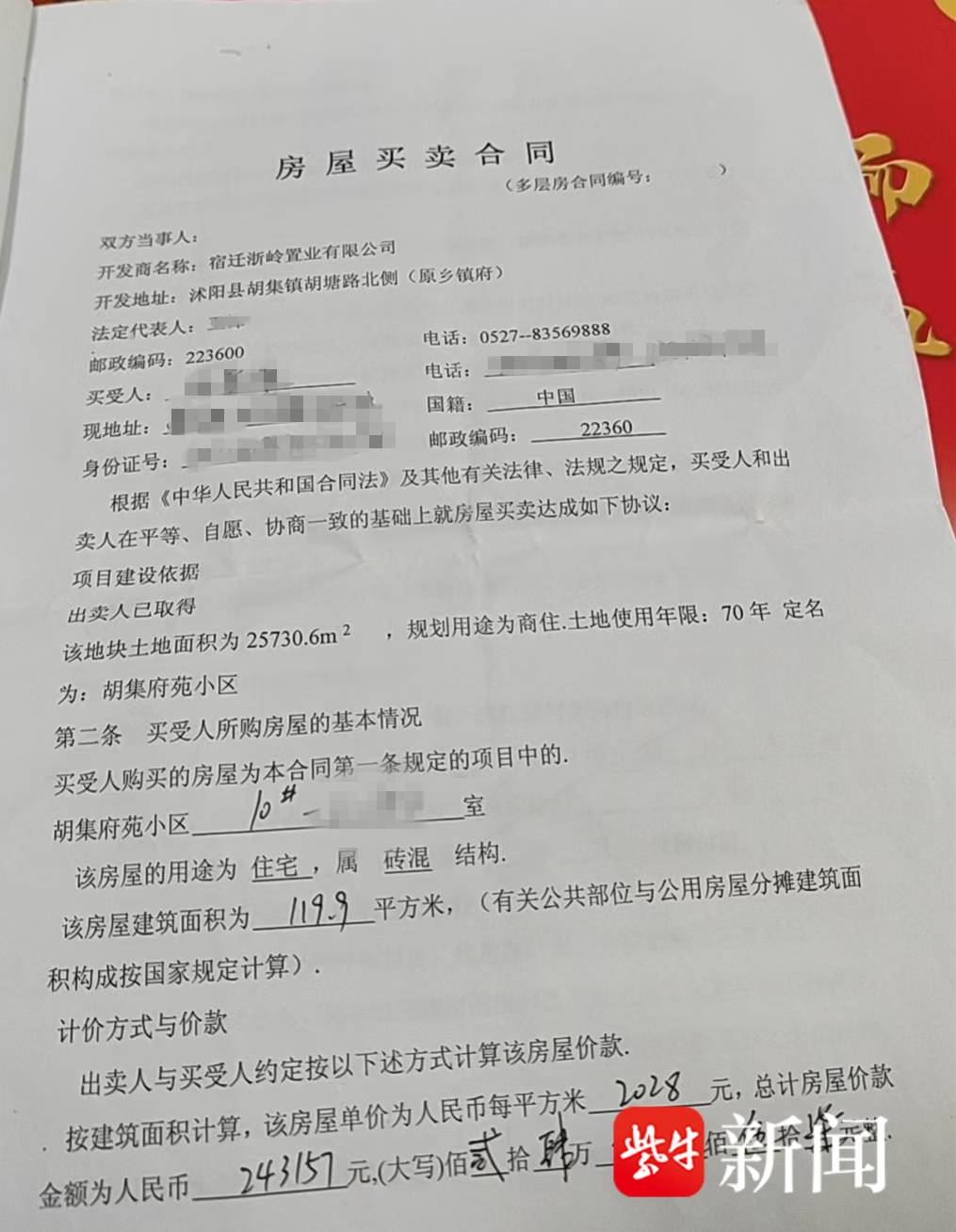 近日,宿迁沭阳的郇先生向问政江苏反映,2014年,他在胡集镇府苑小区购买了一套商品房,开发商称有70年产权。可12年过去了,一直无法办理房产证,他到相关部门了解后才得知其购买的楼栋超出了规划红线。