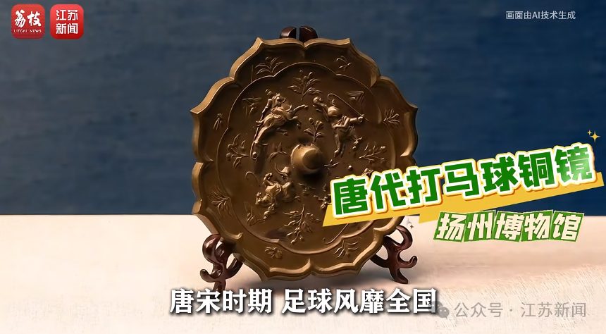 唐宋时期,足球风靡全国,经济实力NO.1的扬州人把蹴鞠玩成了日常,这面铜镜就有跃马击球的盛况。