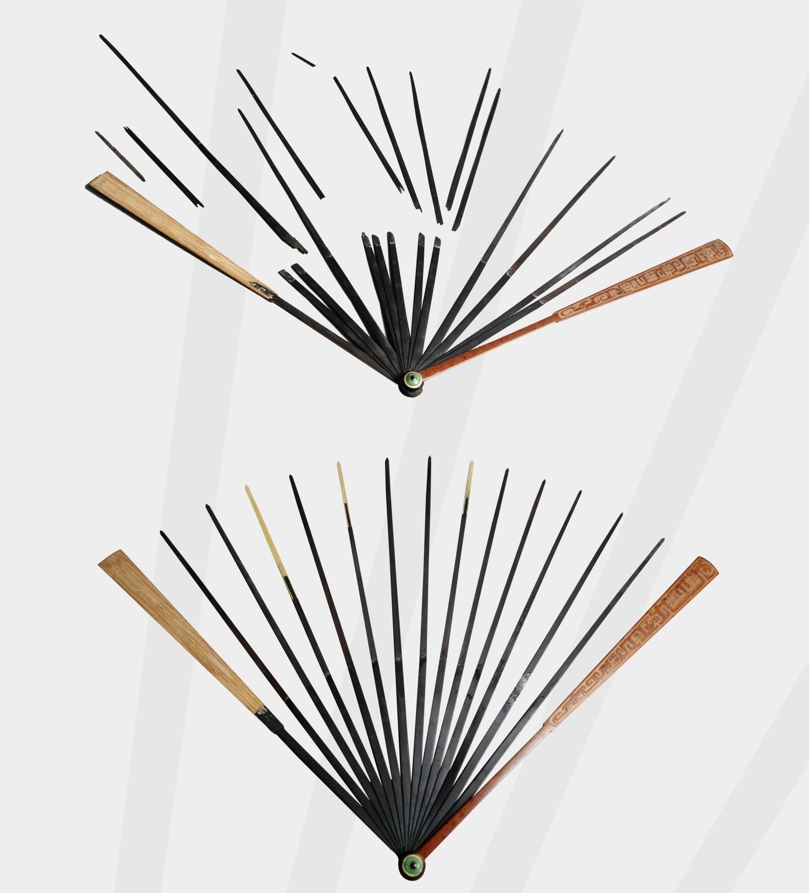 接下来就是将残断、补缺的扇骨粘合还原。此前通常的办法是将断裂处进行对接粘合。缺点是粘得太薄容易脱胶,太厚则会破坏了扇骨原状,难以扦插扇面。为了解决这一难题,专家从中国传统古建营造技术获得了灵感,大胆采用“榫卯”与“燕尾”这种构件连接方式,新旧扇骨严密镶合不仅增加了粘接强度,而且不影响扇骨的厚度及长度,达到折扇还原的目的。