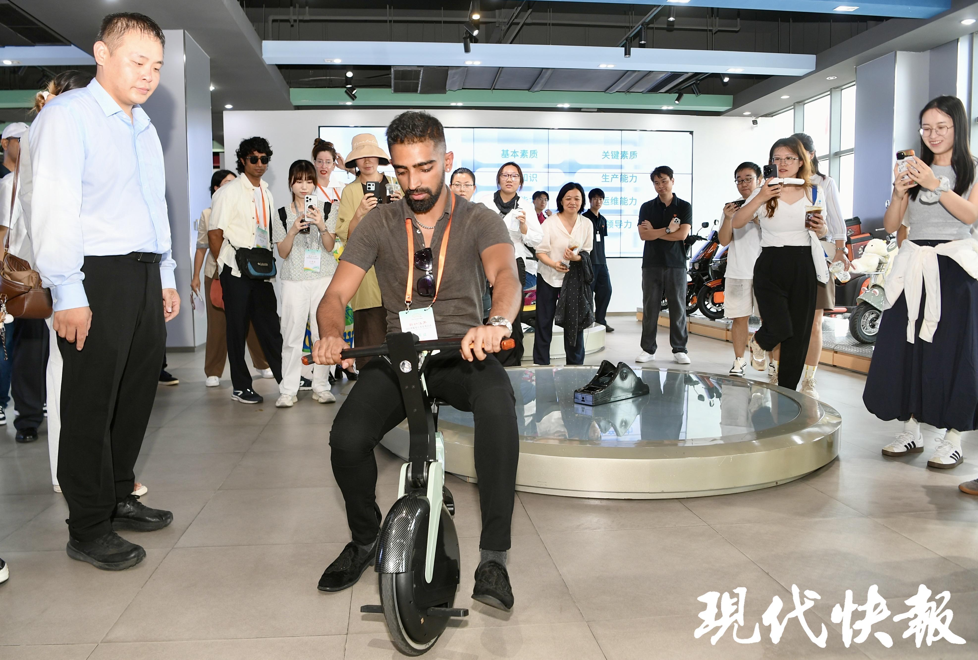 作为国内电动车行业首家上市企业,雅迪拥有全球十大产研基地,产品出口全球100个国家。在位于无锡市锡山区的雅迪科技集团总部,采访团先后参观了车间产线和展厅。在展厅内,工作人员介绍新款电动车的一键折叠、感应解锁、智能驾驶等新功能,外媒记者发出阵阵惊叹声,并用手机拍下这些炫酷的新产品。
