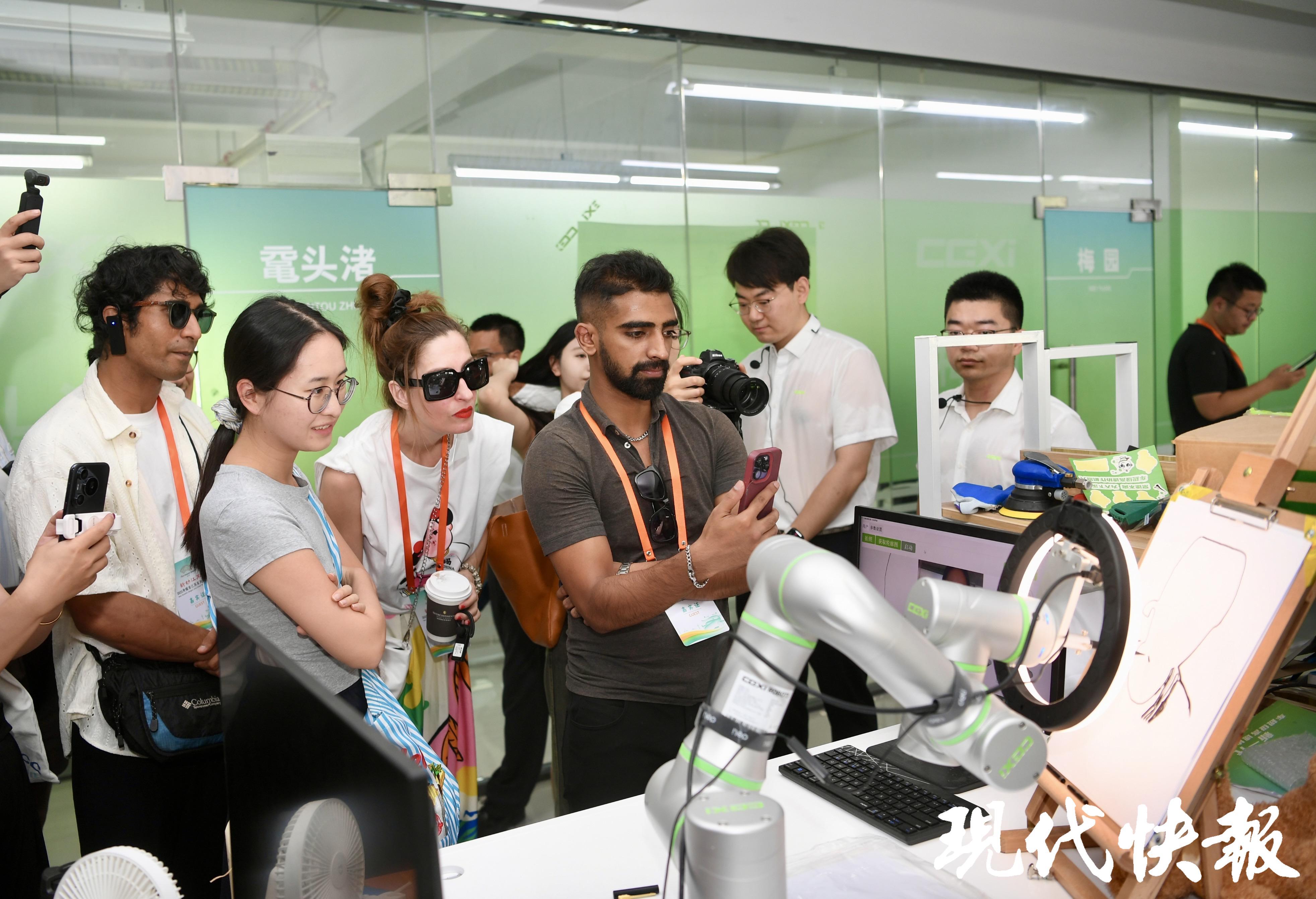 20日上午,外媒记者们走进长广溪智能制造(无锡)有限公司。该公司位于江苏无锡风景秀丽的长广溪河畔,是一家以智能运动控制技术为核心的高新技术企业,专注于协作机器人、汽车智能部件等产品的设计开发、制造与销售。在三楼应用研发中心,画肖像、写书法、双语互动,各类机器人“花式”炫技。