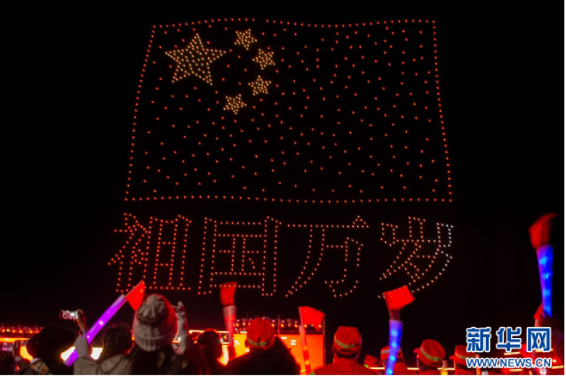 图为第九届象雄文化旅游节开幕式现场的无人机表演(9月26日摄)。新华网 柑丹鸯琦摄