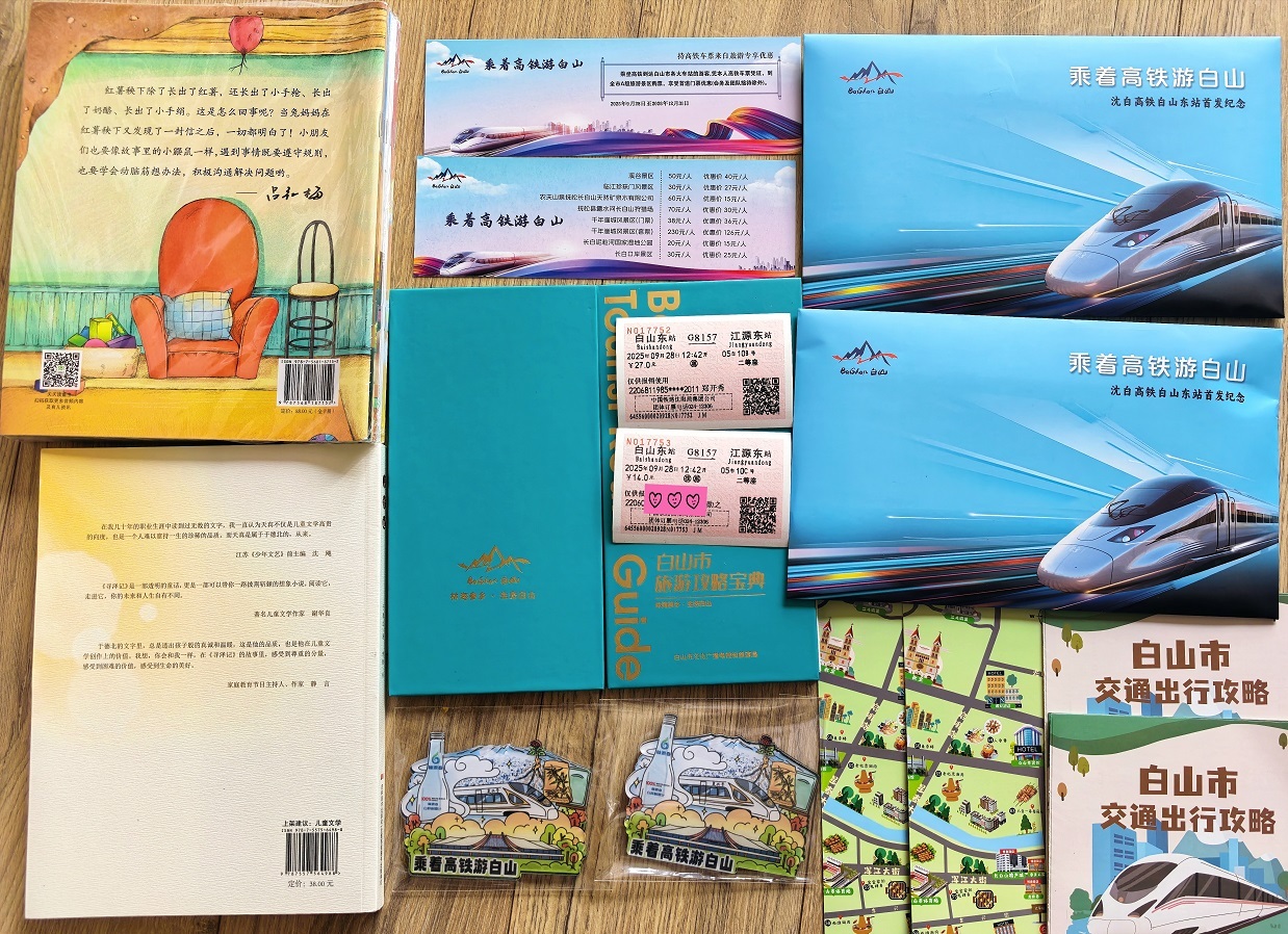 9月28日12:40,当双脚踏入沈白高铁的车厢,崭新的座椅、宽敞的空间瞬间让人眼前一亮。12:42,列车缓缓启动,继而呼啸向前,窗外的金秋盛景如流动的画卷:金黄的玉米田翻着浪,染红的枫叶缀满枝,远山含黛,近树含情,一切都在视野里快速铺展又轻轻掠过。车厢里没有喧嚣,只有旅客们难掩的激动——有人举着手机记录窗外的风景,有人轻声谈论着高铁开通的喜悦,橡果则趴在窗边,小手指着掠过的景物,眼中满是好奇与欢喜。出站后,还有幸收到文旅部门赠送的精美图书和印刷精良的“沈白高铁白山东站首发纪念封”,里面装着《白山市旅游攻略宝典》《白山市交通出行攻略》《白山市美食地图》《乘着高铁游白山专享优惠》、冰箱贴等惊喜文创礼物,真可谓诚意满满。走在宽敞明亮的高铁站大厅里,随处可见为了旅客出游而忙碌的安保、警察及志愿者们,突然想起了五年里那些曾栉风沐雨、攻坚克难,默默地辛勤修建这条铁路的工人们,真应该感谢让我们的生活越来越幸福的所有人。