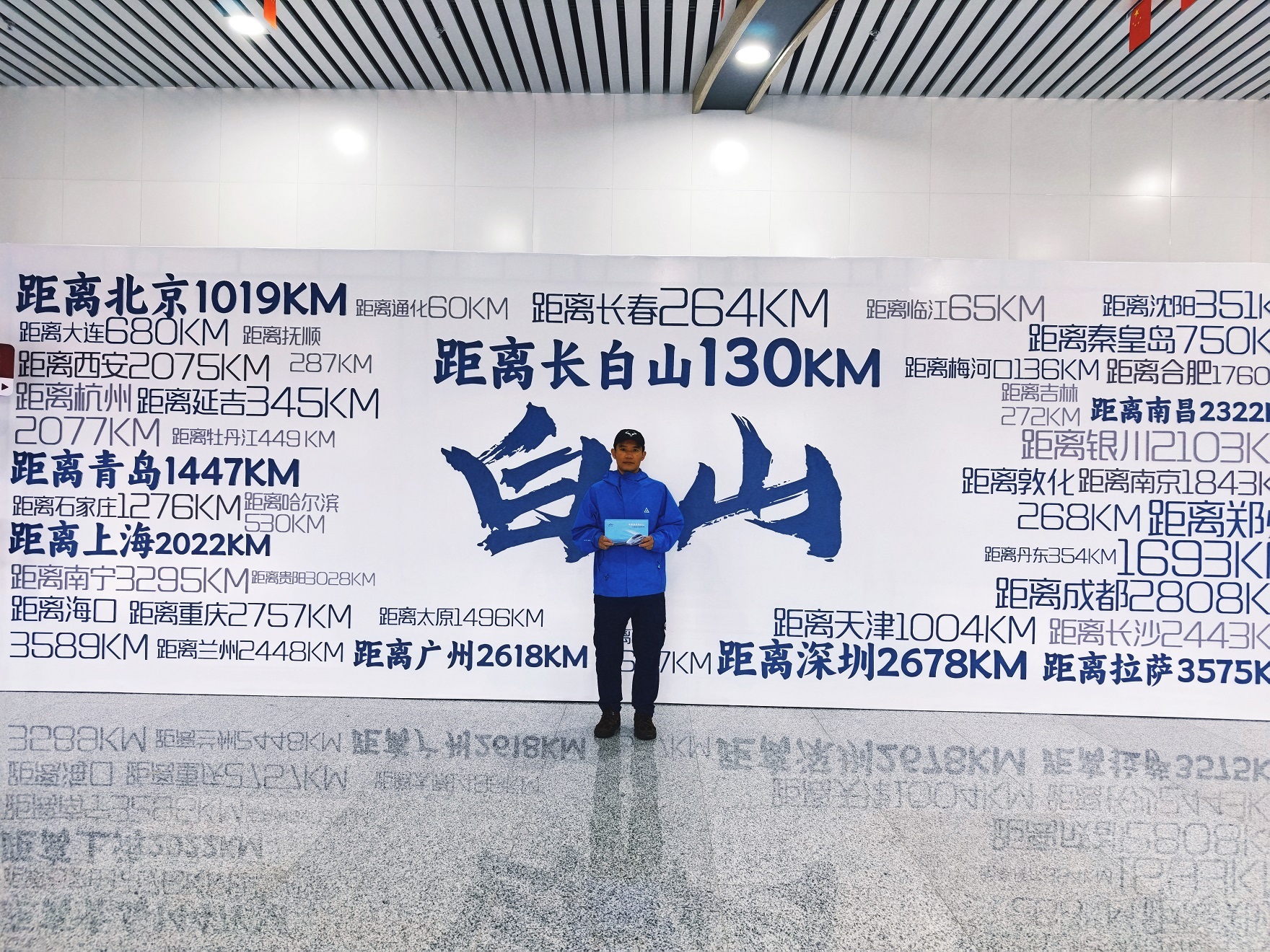 旅程的序章始于前一日。9月27日清晨,我刚跑完一场半程马拉松,休息片刻,便载着橡果骑上山地自行车,从家门口出发,沿北安大街缓缓前行。11.37公里的路程,没有匆忙的赶路,只有秋风里的惬意与儿子雀跃的呢喃,最终顺利抵达白山东站。按相关规定,不满六周岁的橡果本可免票,但我还是特意为他买下人生中第一张半价火车票(2025年10月1日起,纸质火车票将正式退出历史舞台,所以,这也是他人生中唯一的一张纸质火车票)——这张小小的粉色票根,是他成长的纪念,更是属于父子俩的专属仪式。购完票后,我们在还未正式运营的白山东站站牌下、候车厅前拍了一张又一张打卡合影,镜头里的笑容,成了出发前最温暖的注脚。