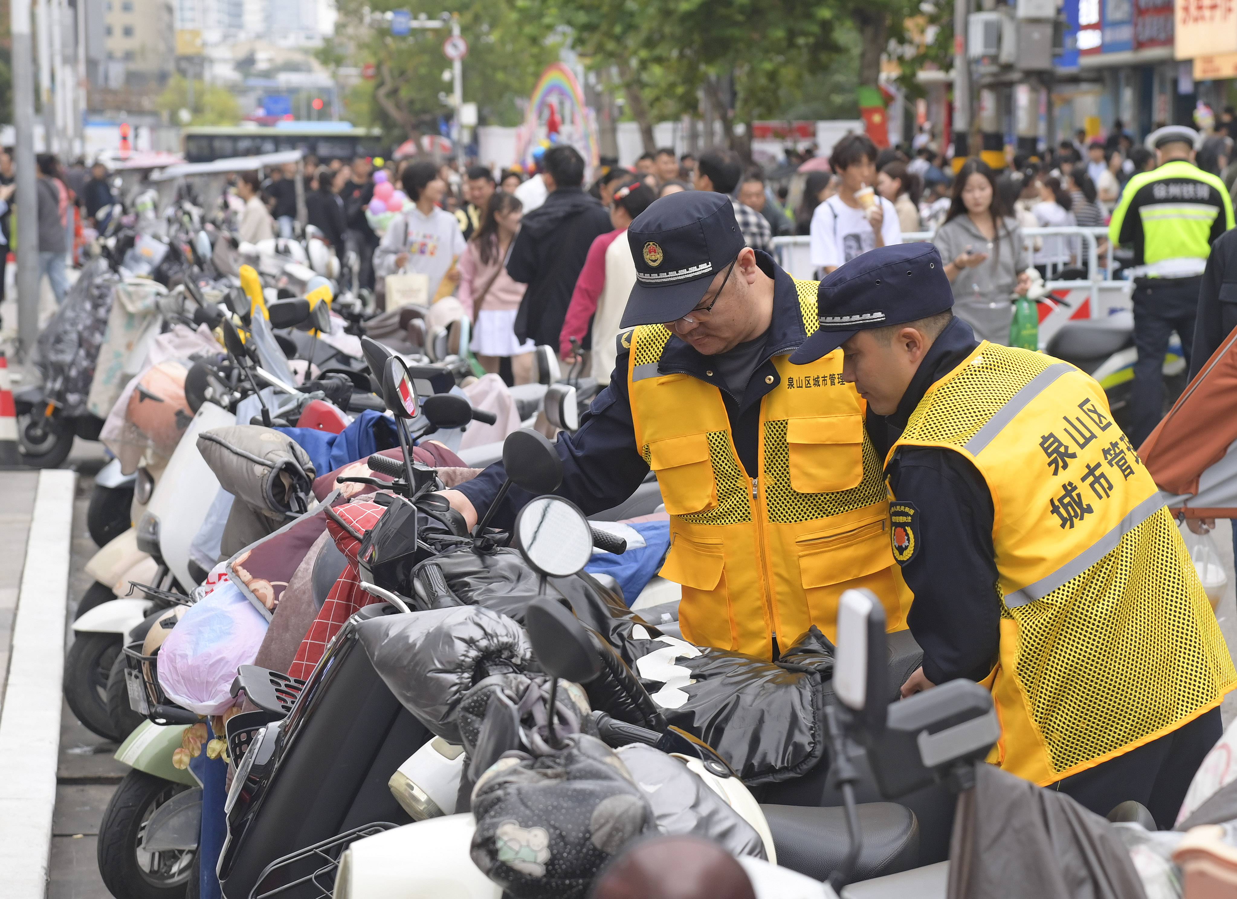 在滨湖公园东门、池杉林、云龙山西门等流动摊点高发点位,以及水上世界等客流密集区域,日均增派执法力量30人次,增加12:00—13:30、17:30—20:30两个值班班次,严格落实“定人、定岗、定责”制度,保证重点时段执法管理不断档,切实做到“发现即劝导、违规即处置”。