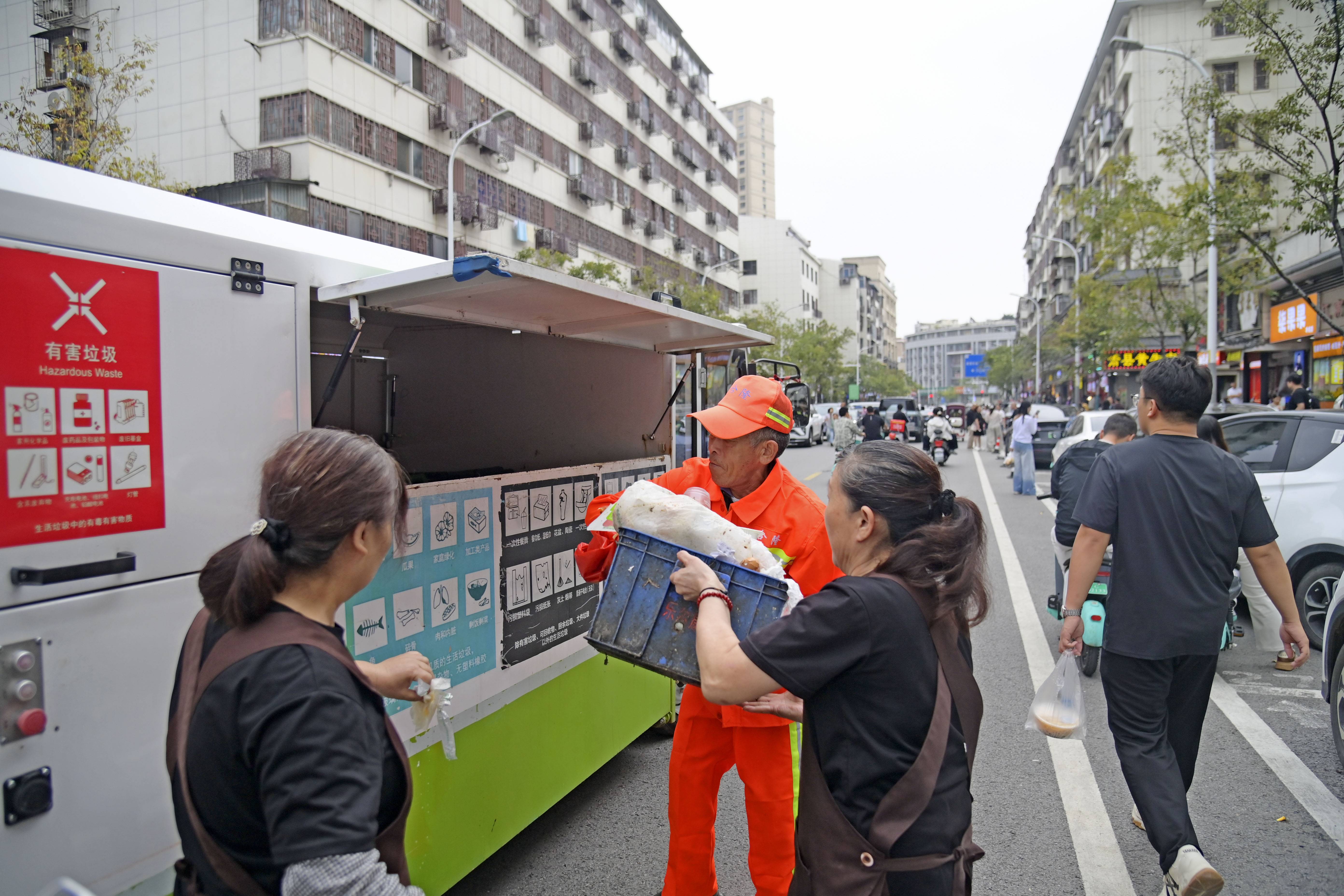 如厕问题解决了,垃圾清运也及时跟上。考虑到丰储街假期日均1—2万人次的人流量会让商户异常忙碌,云龙区城管局适时投放垃圾分类上门收集车。