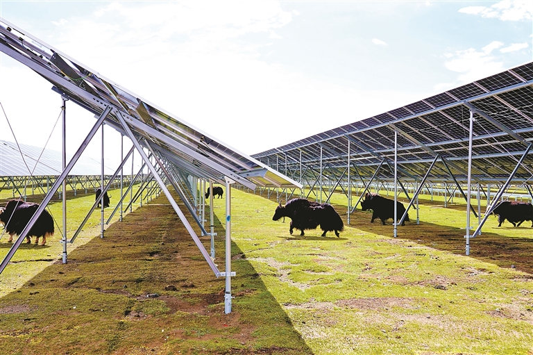 光伏板下悠然吃草的牦牛。记者 袁海霞 摄