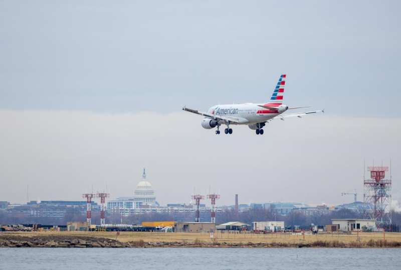 2024年12月24日,一架美国航空公司飞机降落美国弗吉尼亚州阿灵顿的里根国家机场。新华社记者胡友松摄