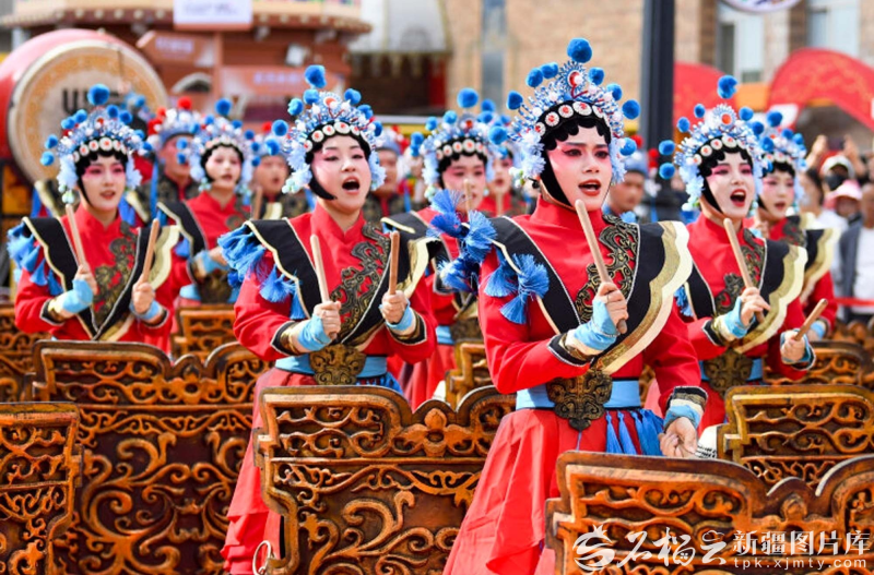 10月1日,“忠勇杨家鼓”表演在乌鲁木齐大巴扎步行街震撼上演。石榴云/新疆日报记者 汤永摄
