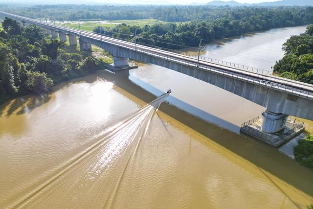 ↑10月10日,在马来西亚彭亨州,一艘船驶过马东铁项目跨关丹河特大桥(无人机拍摄)。