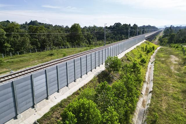 ↑这是10月10日在马来西亚彭亨州马东铁项目拍摄的一处隔音墙,可降低噪音问题对周边环境和居民带来的影响(无人机照片)。