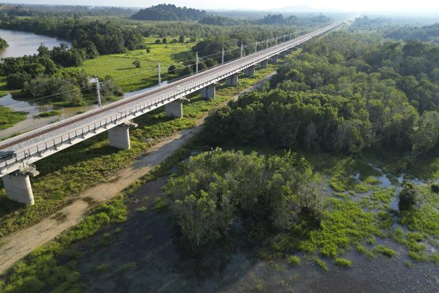↑10月9日,在马来西亚彭亨州,马东铁轨道穿越一片湿地(无人机照片)。