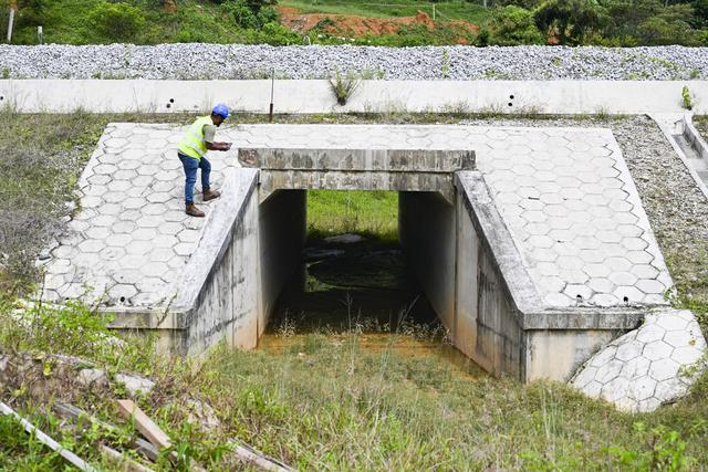 ↑这是10月10日在马来西亚彭亨州马东铁项目拍摄的环境官彻·万·巴祖,他在一处动物涵洞检查马来貘、野猪等野生动物的踪迹。