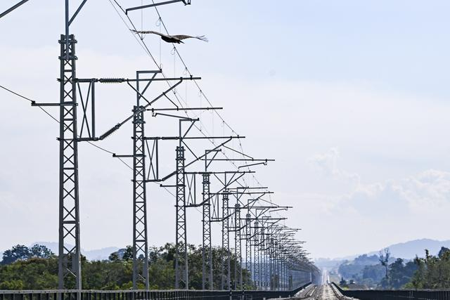↑这是10月10日在马来西亚彭亨州拍摄的马东铁项目,笔直的铁路贯穿茂密的雨林(无人机照片)。