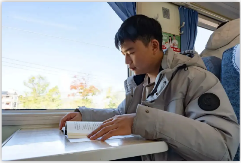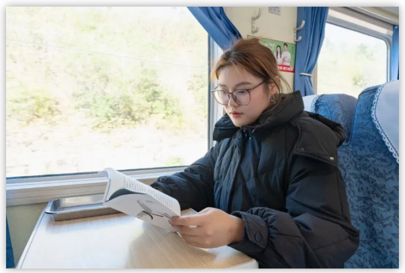旅途中累了,便看看车窗外“绿水青山画中游”的美景,感受车厢里“南腔北调话家常”的鲜活。若有人问起读的什么书,便能畅聊感悟、以文会友,这何尝不是一种文雅的高光时刻?
