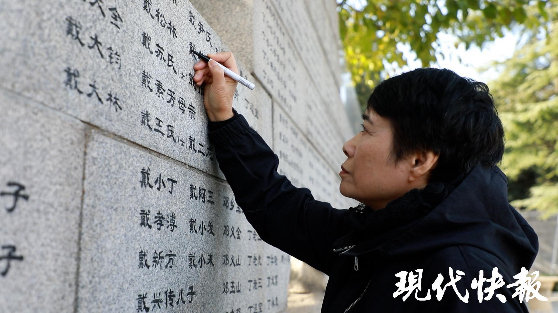 常志强的女儿常小梅在给“哭墙”上亲人名字描新