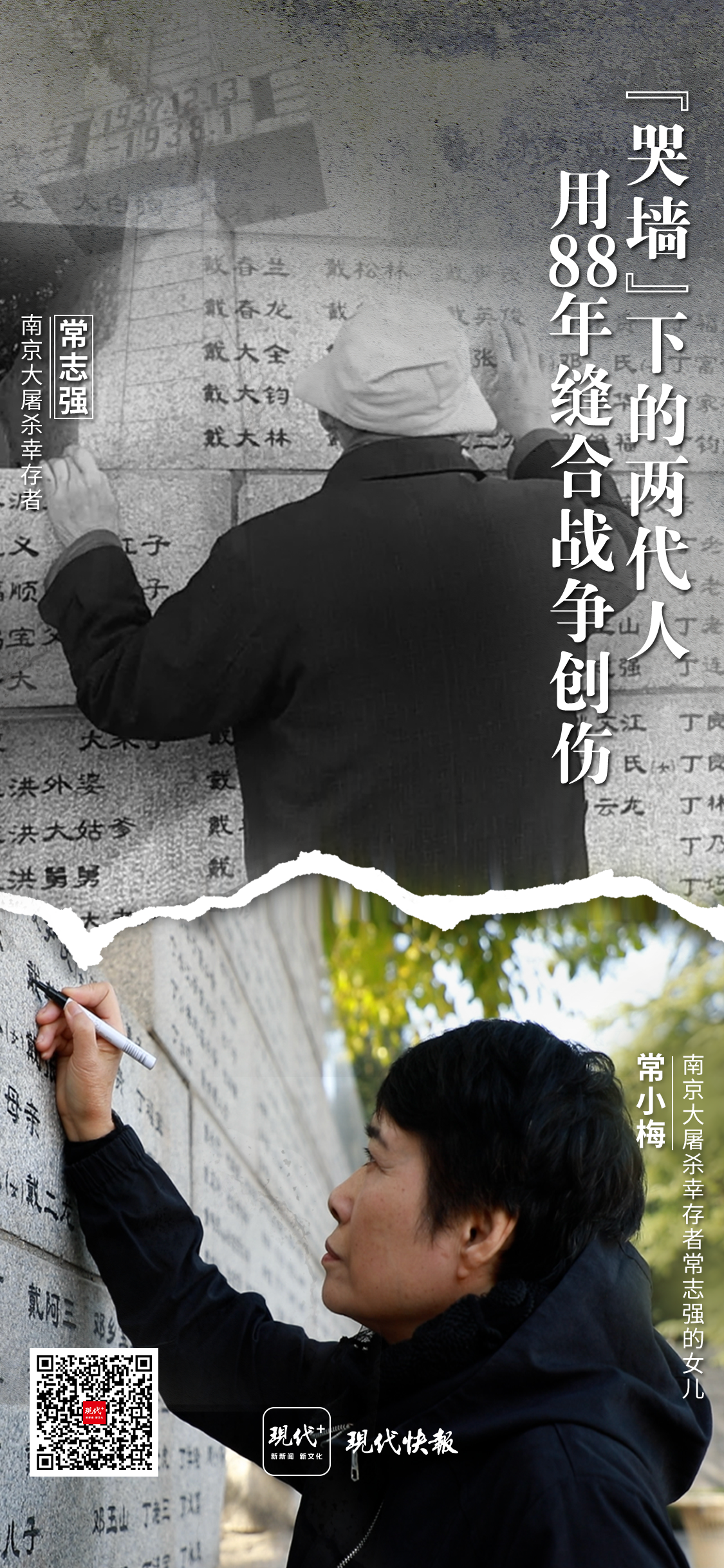 “每次站在侵华日军南京大屠杀遇难同胞纪念馆前,耳边总会响起一声撕心裂肺的哭喊,‘妈妈,你醒醒’,那是九岁的常志强在1937年的寒冬里,对着倒在血泊中的母亲一遍又一遍地呼喊……”2025年初冬的南京,常小梅站在“哭墙”前诉说着这段家族史,这是她对父亲常志强的思念,也是她在替父亲讲述这段历史。