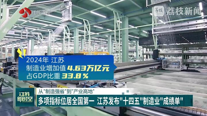 2024年,江苏制造业增加值4.63万亿元,占GDP比重达33.8%,连续4年稳居第一制造业大省,实体经济的底盘更加稳固,产业整体竞争力持续增强,为高质量发展提供了有力支撑。