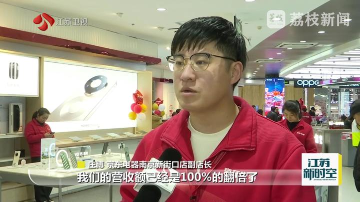京东电器南京新街口店副店长庄博说:“从国补上线9点钟开始,和去年同期1月1日相比,我们的营收额已经是100%翻倍。通过去年一整年补贴,我们店里整体消费增长了100%。”