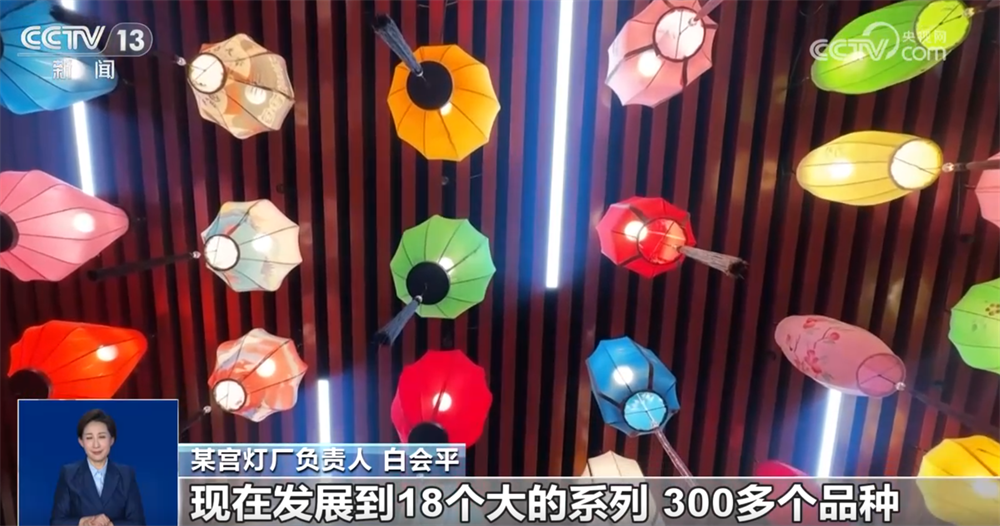 某宫灯厂负责人 白会平:通过跟大专院校合作,研发新的产品,每年都得有一个新的突破。现在我们国潮风的灯笼特别受年轻消费群体的喜欢。原来我们是单一的几个品种,现在发展到18个大的系列、300多个品种,而且根据客户的要求还可以量身定做。