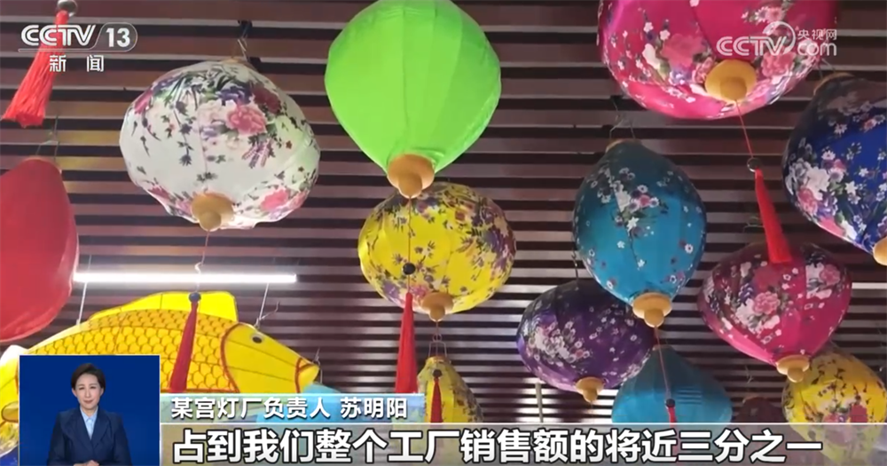 某宫灯厂负责人 苏明阳:现在一天直播4小时—5小时,到年底我们一天开播将近16个小时。在线上卖,占到我们整个工厂销售额的将近三分之一。