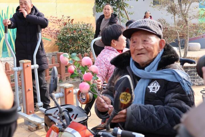 不远处,81岁的胡广友和89岁的周立民两位老人正聊得兴起,他们是几十年的老友,正相约着年三十要一起喝杯团圆酒。龙固镇沙河村104岁的姜敦谦老人一现身,便成为全场焦点,两村老小争相问候。老人精神矍铄,声音洪亮:“好多人的父辈是我的学生。我家儿孙辈里有八个教书匠。我现在每天都要来这舞台边转转,一场戏都不愿落下。”