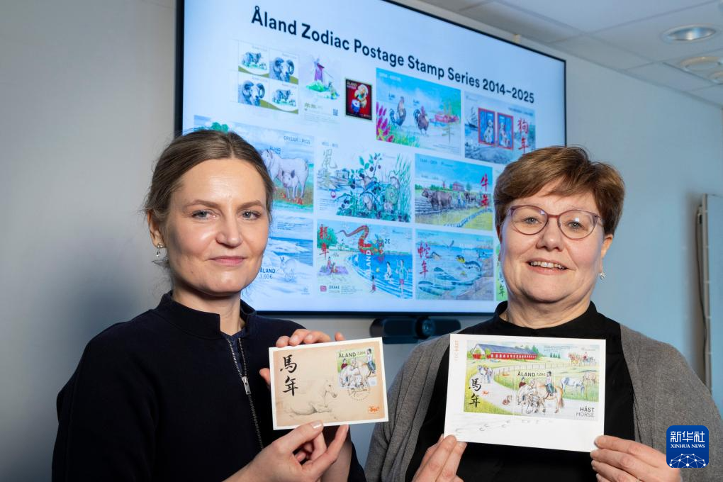 1月21日,在位于芬兰奥兰群岛自治区首府玛丽港市的奥兰群岛邮政署总部,工作人员展示马年生肖主题邮票及邮政产品。新华社发(马蒂·马蒂凯宁摄)