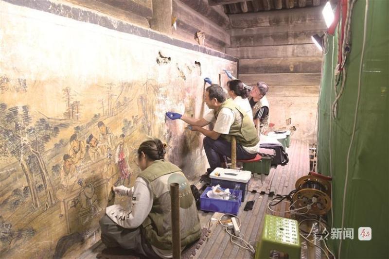 2025年7月,陕西省文物保护研究院(陕西省文物鉴定研究中心)工作人员修复东岳庙壁画(资料照片)。 受访者供图