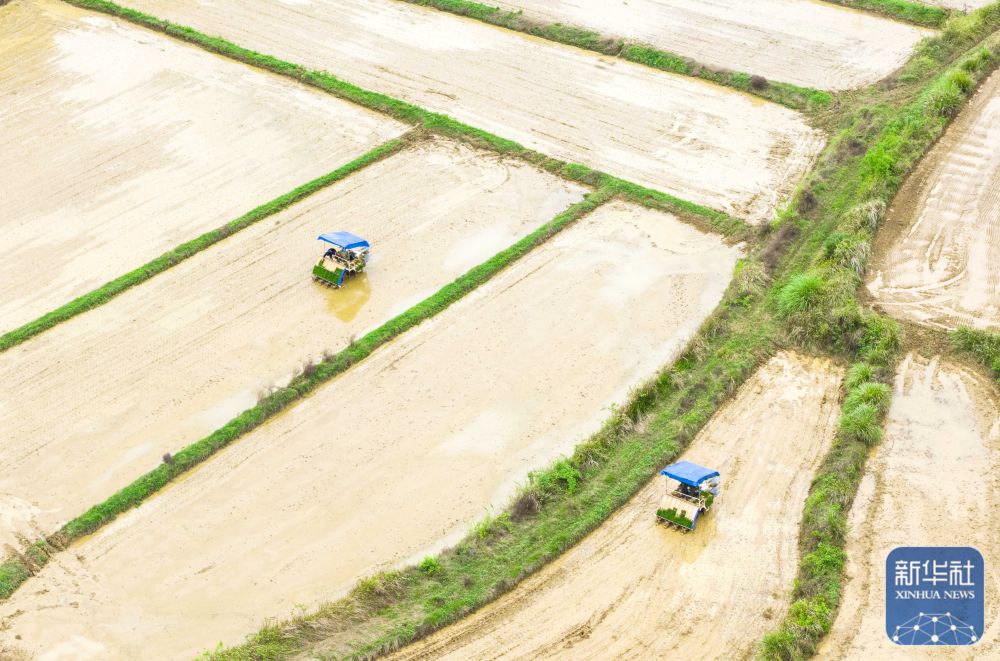 ↑ 4月9日,江西省九江市都昌县汪墩乡细桥村,农民驾驶插秧机进行插秧作业(无人机照片)。新华社发(傅建斌摄)