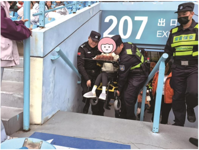在应对天气变化中,执勤警力提前备好雨衣,遇降雨天气第一时间向现场球迷免费发放,并引导群众就近避雨。当天下午4时40分,一位母亲携行动不便的女儿,因人流密集难以进场,常州市公安局经开区分局巡特警大队副大队长李赟见状立即上前,带领队员小心翼翼将母女平稳护送至观赛区座位,助其顺利观赛。