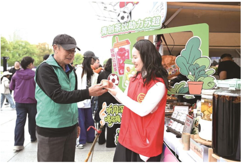 作为“苏超”揭幕战的配套特色活动,场外主题集市深度融合体育激情与市井烟火。在奥体中心主场馆入口旁,志愿暖心公益茶饮摊位前人头攒动。这是天福志愿服务中心第二年参加“苏超”活动。“玫梅公益茶和益心春甘饮,是我们自创的配方,随着气温逐渐升高,我们还会根据时令调整茶饮的品种和配方,争取让球迷游客拥有更加舒适的观赛体验。”志愿者李欣谕介绍,此次提供服务的“青橙一杯”茶饮创业项目由宝妈和大学生创业者组成。