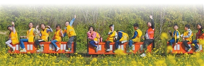 重庆市北碚区歇马街道虎头村,青少年们乘坐小火车感受乡村田园之美,乐享春日假期。 秦廷富摄 |