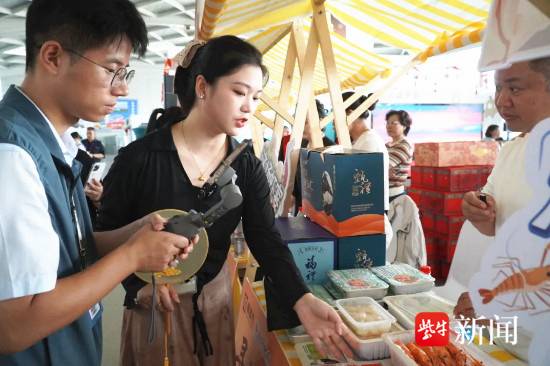 记者注意到,高邮湖大闸蟹也亮相市集。高邮湖湖水清澈,生态优越,高邮湖大闸蟹被列为国家地理标志产品,是高邮市的特色水产品之一,在北宋年间就已成为皇家贡品。当地蟹农形容高邮蟹“背青,肚亮,爪金,膏红,口感紧实”。现场展陈的高邮大虾同样吸引旅客目光。高邮湖大虾肉质鲜嫩、味道鲜美,营养丰富。“原来高邮不仅有咸鸭蛋,还有这么多优质水产呢。”一位旅客购买了高邮咸鸭蛋和高邮大虾后,对高邮的美食文化产生了浓厚兴趣。