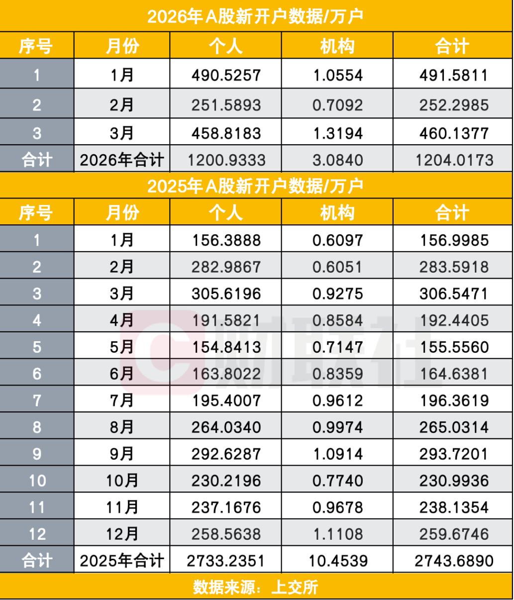 结合2025年全年新开户数据来看,460万户高于2025年所有月份,高于2024年的11个月份。至此,2026年第一季度已新开1204万户,同比增长61%。