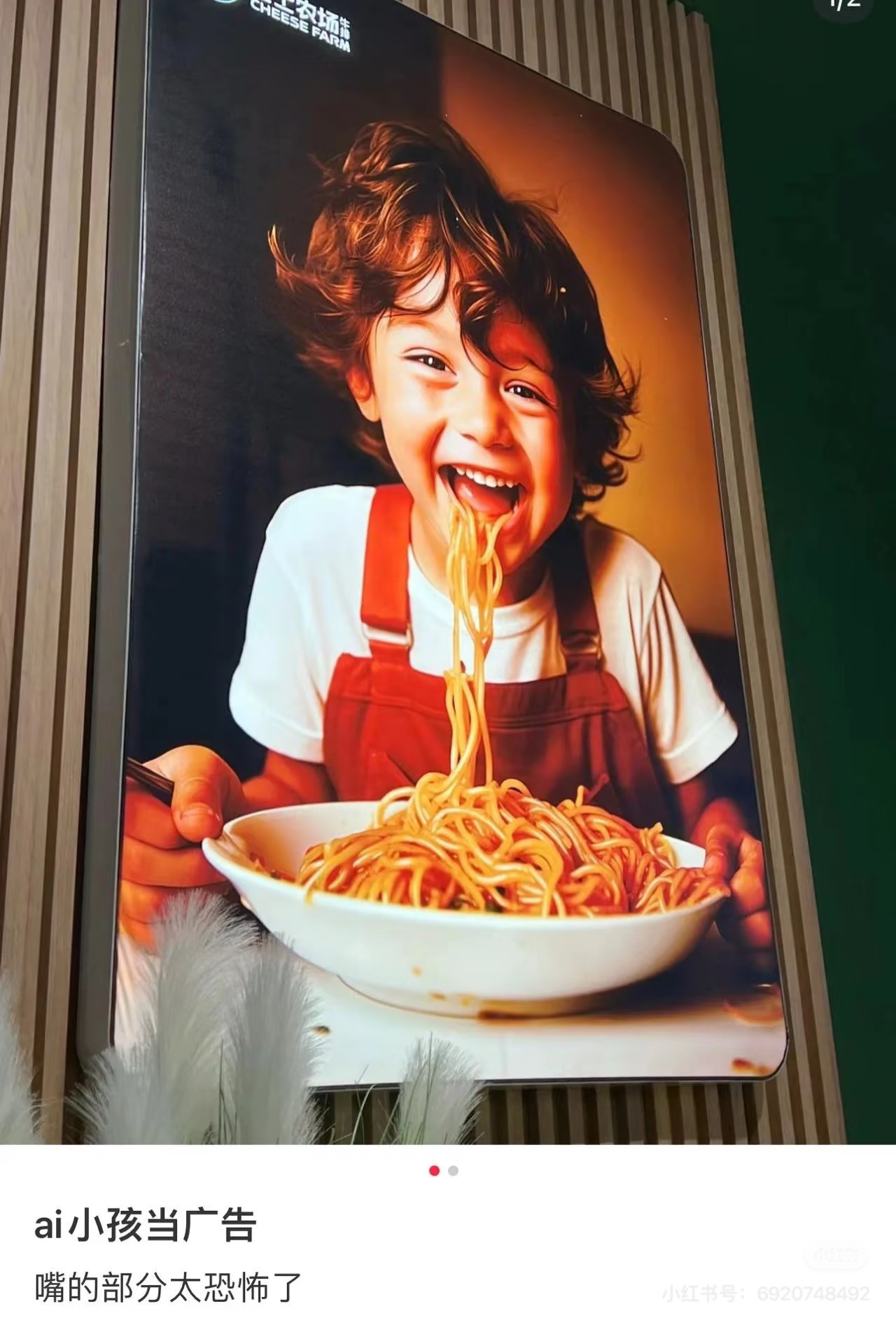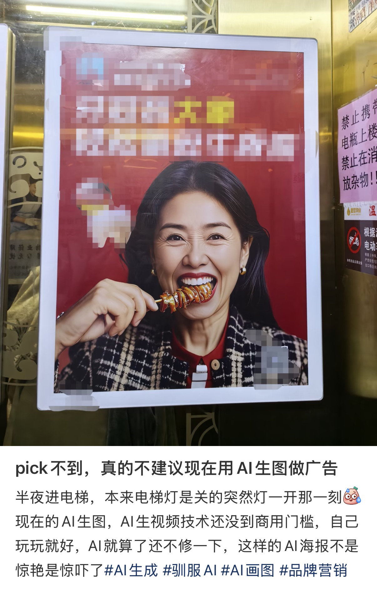 “AI泛滥的时代,国贸地铁站海报每分钟吓哭26个小孩”,这是一位网友的调侃,虽是玩笑,却也折射出真实存在的“公共视觉污染”。近年来,AI广告充斥地铁、电梯等公共空间,让人生理不适的案例比比皆是。在社交平台输入“AI广告”搜索,就能看到大量网友的带图吐槽——有的旅游广告,用AI把目的地渲染得毫无吸引力;有蛋糕店广告,人物出现畸变,手指扭成一团;还有的保健品广告中,人物有六根手指,方便面广告里的面条“长”在人物嘴边……