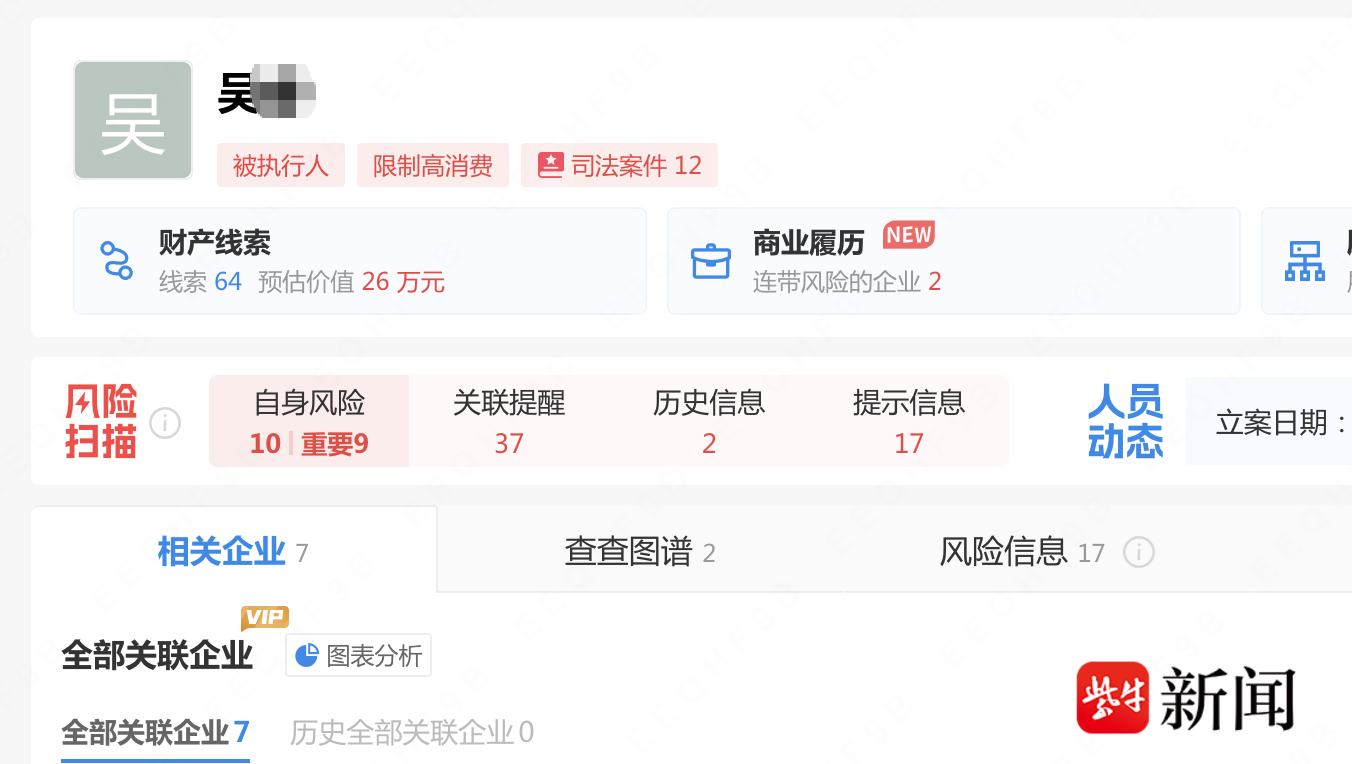 记者调查发现,与张女士签署欧洲定制游合同的武汉西米文化艺术交流有限公司经营范围包括文艺创作、信息咨询服务、因私出入境中介服务、自费出国留学中介服务、票务代理服务等,但不包括旅游业务。该公司法定代表人为吴某,天眼查信息显示,吴某在7家公司任职,是6家公司的法定代表人,自身风险6条,周边风险59条,开庭公告16个,包括服务合同纠纷、股权转让纠纷、追索劳动报酬纠纷等,名下数家公司被法院列为限制高消费企业,他本人也被限制高消费。